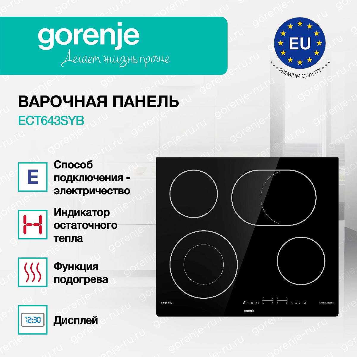 ** Все информационные материалы, представленные на Сайте, носят справочный характер и не могут в полной мере передавать достоверную информацию о свойствах, комплектации и характеристиках товара, включая цвета, размеры и формы. Фирма-производитель оставляет за собой право на внесение изменений в конструкцию, дизайн и комплектацию товара без предварительного уведомления. Перед оформлением Заказа Покупатель должен обратиться к Продавцу для уточнения свойств и характеристик Товара. Подробная информация о товаре указывается в инструкции и на упаковке товара. Используемое название в России: Горенье ECT643SYB