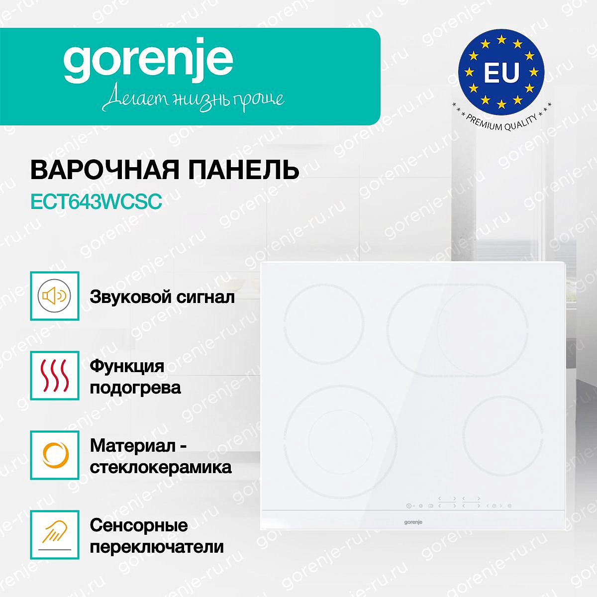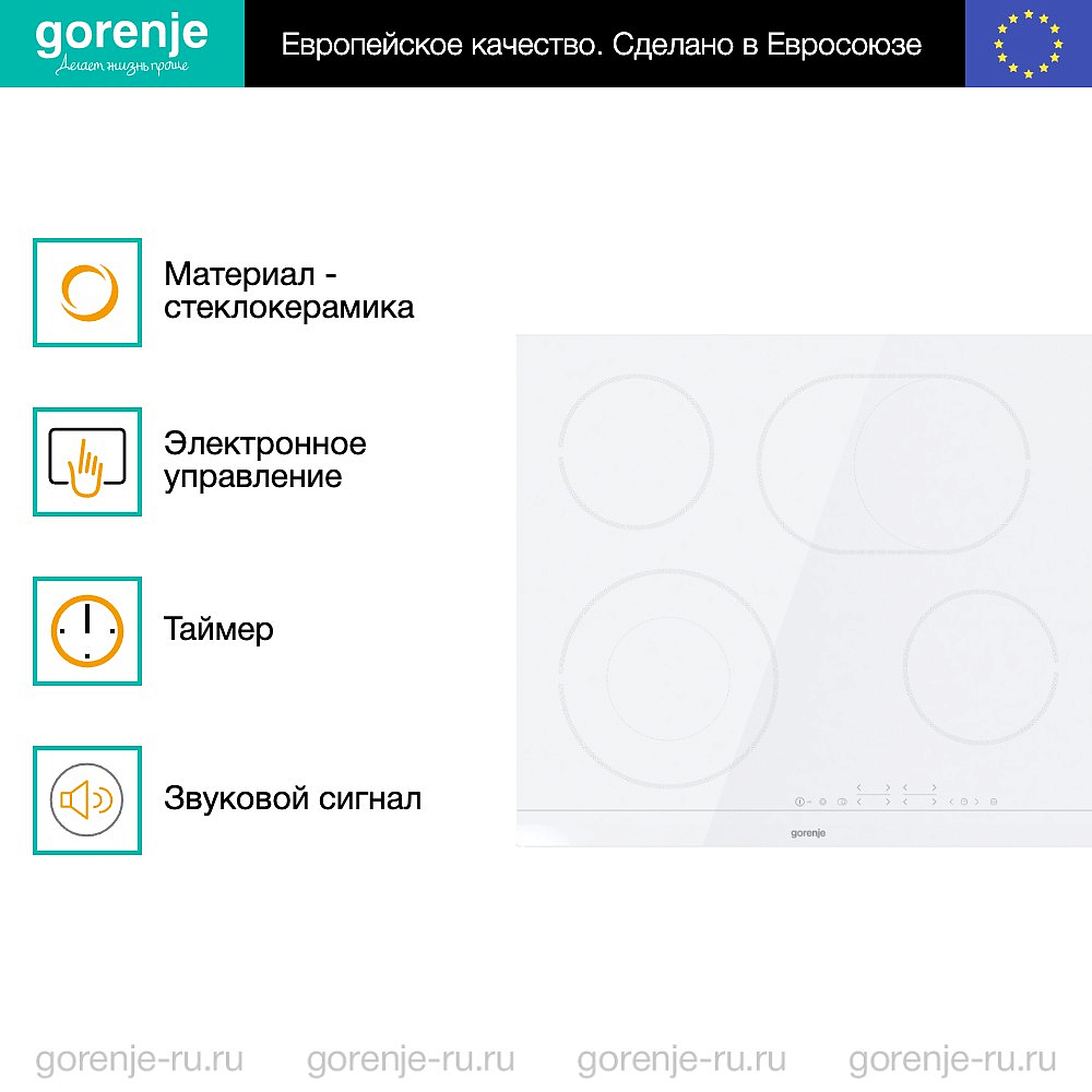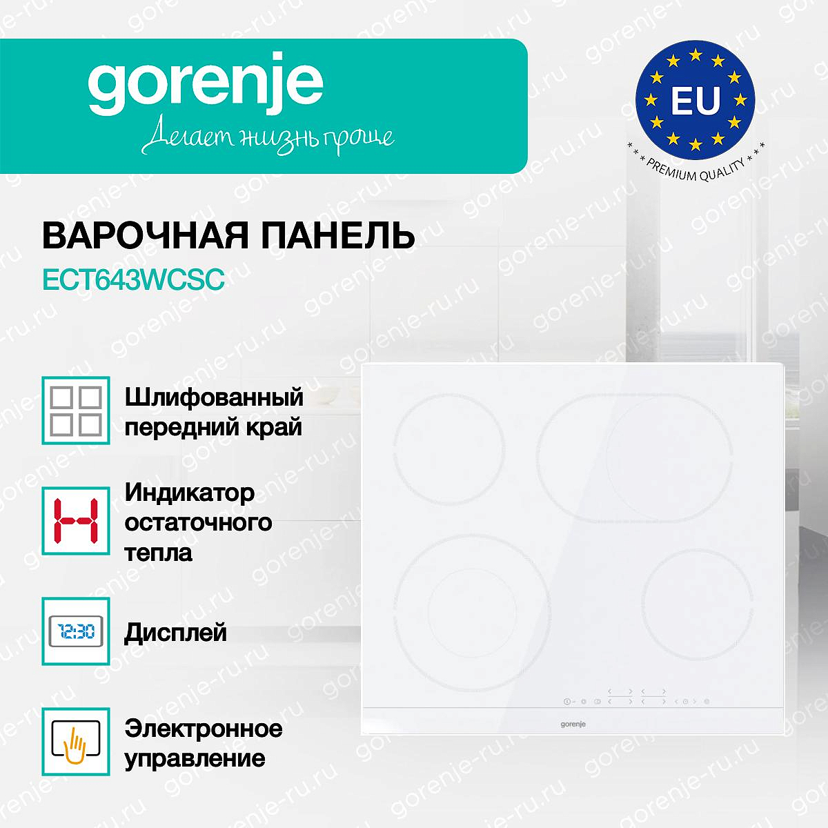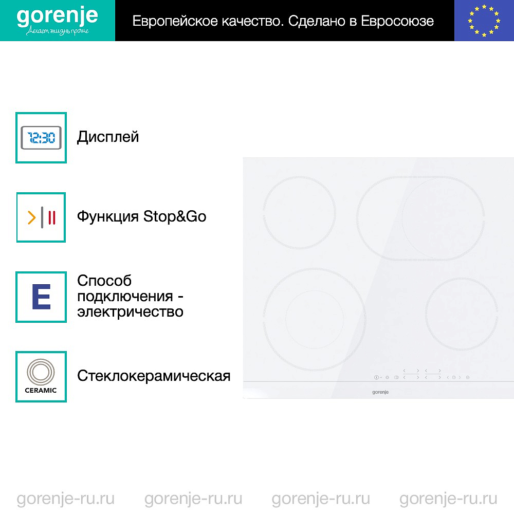 ** Все информационные материалы, представленные на Сайте, носят справочный характер и не могут в полной мере передавать достоверную информацию о свойствах, комплектации и характеристиках товара, включая цвета, размеры и формы. Фирма-производитель оставляет за собой право на внесение изменений в конструкцию, дизайн и комплектацию товара без предварительного уведомления. Перед оформлением Заказа Покупатель должен обратиться к Продавцу для уточнения свойств и характеристик Товара. Подробная информация о товаре указывается в инструкции и на упаковке товара. Используемое название в России: Горенье ECT643WCSC