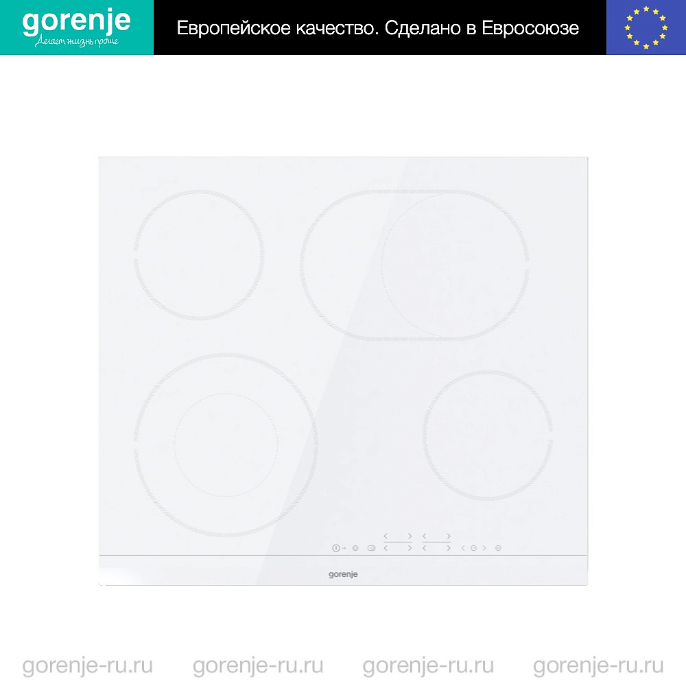 Независимая стеклокерамическая варочная панель Gorenje ECТ643WCSC — модель белого цвета со скошенным передним краем. Сенсорные переключатели позволяют настроить интенсивность приготовления, таймер и настроить специальные функции.