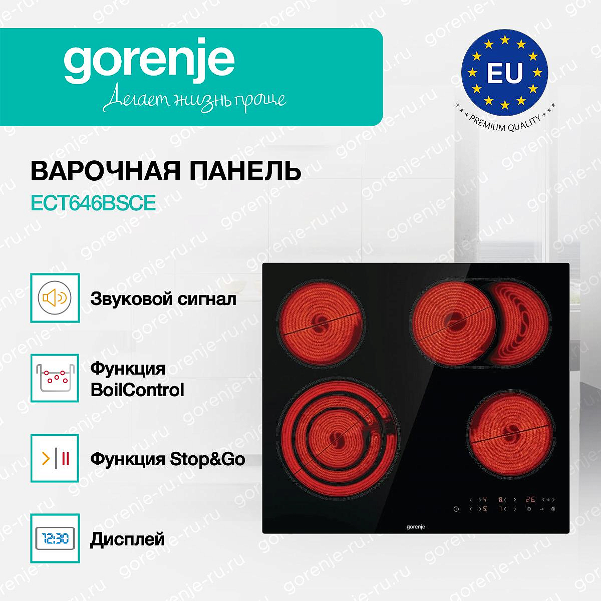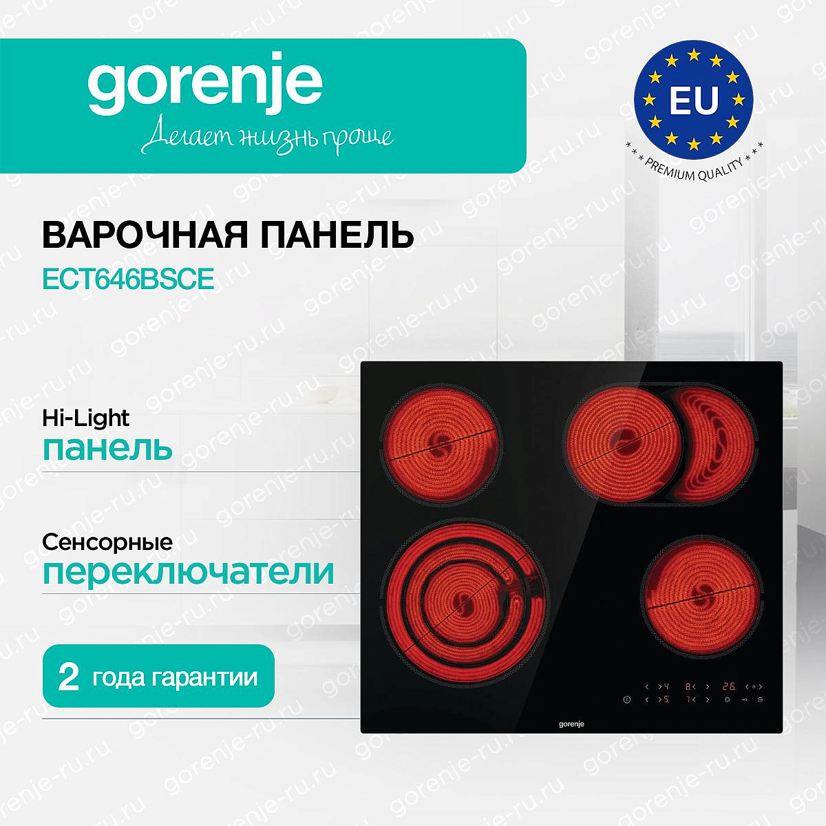 ** Все информационные материалы, представленные на Сайте, носят справочный характер и не могут в полной мере передавать достоверную информацию о свойствах, комплектации и характеристиках товара, включая цвета, размеры и формы. Фирма-производитель оставляет за собой право на внесение изменений в конструкцию, дизайн и комплектацию товара без предварительного уведомления. Перед оформлением Заказа Покупатель должен обратиться к Продавцу для уточнения свойств и характеристик Товара. Подробная информация о товаре указывается в инструкции и на упаковке товара. Используемое название в России: Горенье ECT646BSCE