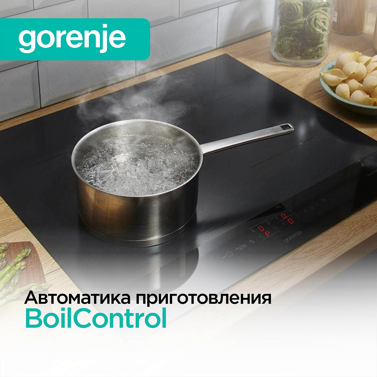 В модели Gorenje IT643SYB присутствует объединённая зона нагрева BridgeZone, которая две рядом расположенные конфорки соединяет в одну большую. Это даёт возможность использовать овальную посуду или пластину для гриля. При этом их края должны перекрывать центры передней и задней конфорок, а максимальный размер — 40×25 см. При включении режима PowerBoost конфорка работает с максимальной мощностью в течение 5 минут и затем автоматически переключается на степень нагрева 9. Автоматика приготовления BoilControl сначала выставляет 9 ступень мощности, а через некоторое время возвращается к заранее установленной (от 1 до 8).