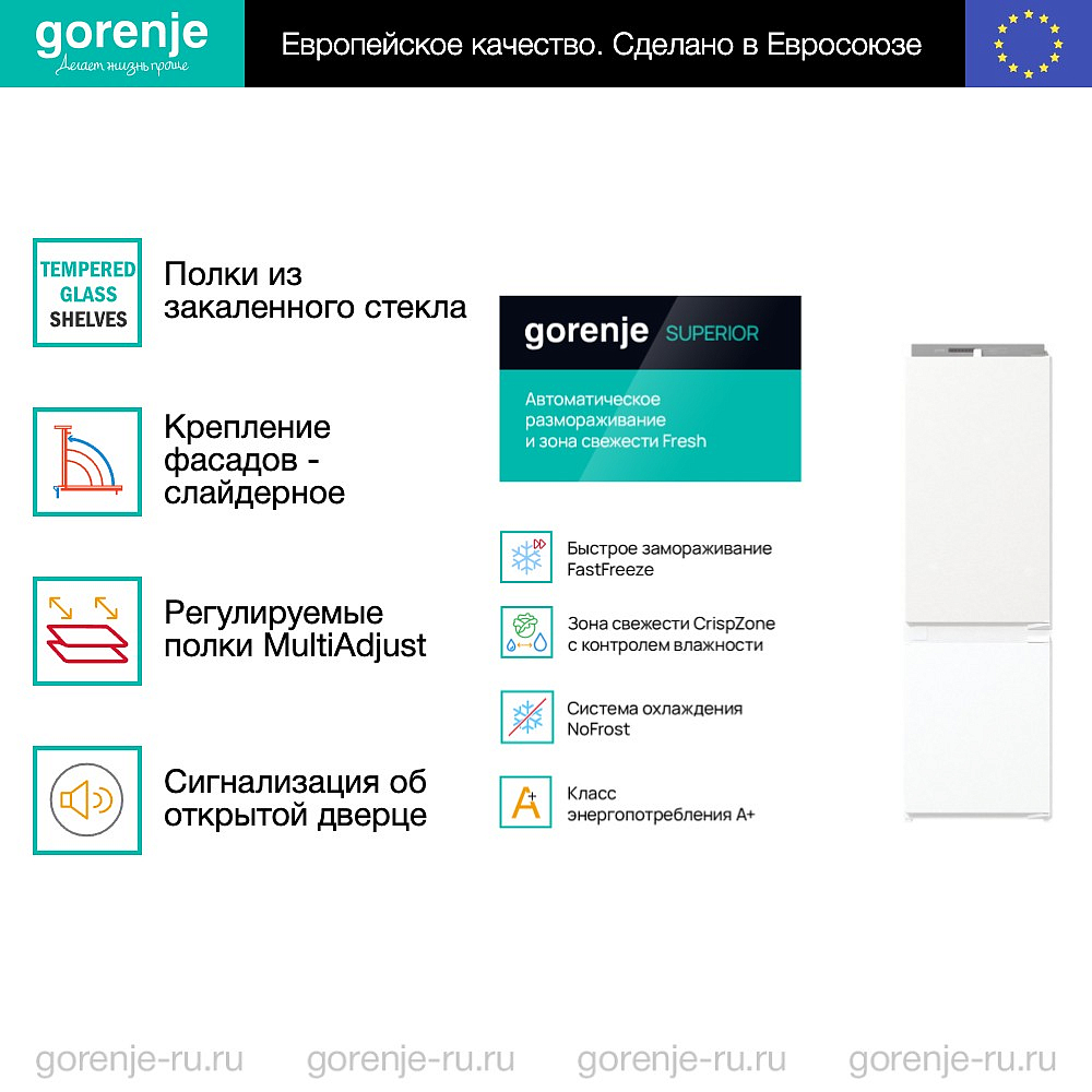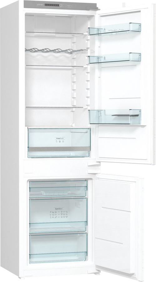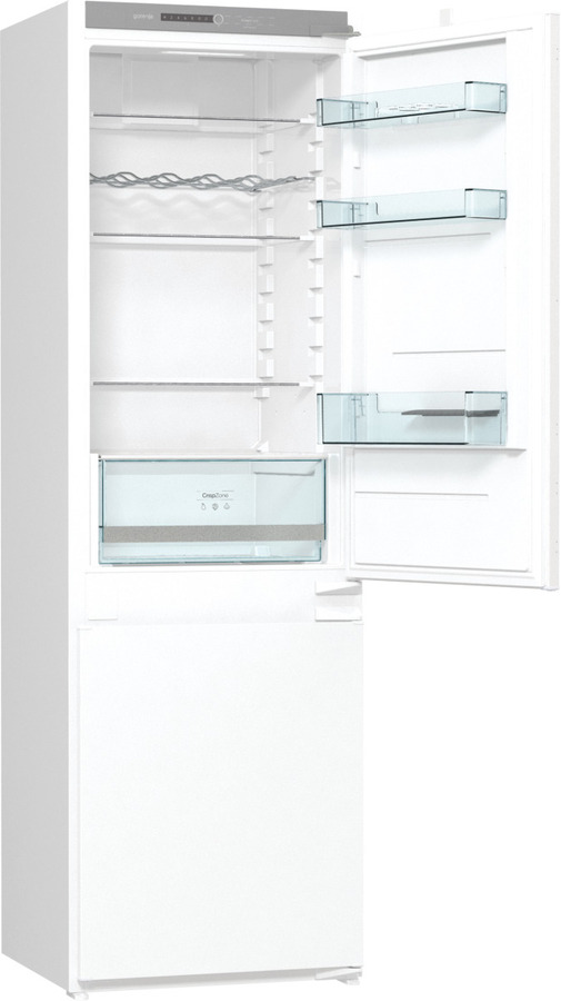 Во встраиваемом двухкамерном холодильнике Горенье NRKI418FA0 используется система быстрого замораживания. Если вы положили внутрь большое количество свежих продуктов, сенсоры это зафиксируют и понизят температуру в морозильной камере. Еда останется вкусной, сохранит свой цвет и форму. В зоне свежести для овощей и фруктов поддерживается оптимальная влажность. Внутри имеется комфортная светодиодная подсветка. Если дверца будет закрыта неплотно, вас оповестит об этом звуковой сигнал. В основном отсеке расположены четыре полки из закаленного стекла. Они очень прочные и выдерживают даже тяжелые кастрюли. Полки регулируются по высоте.