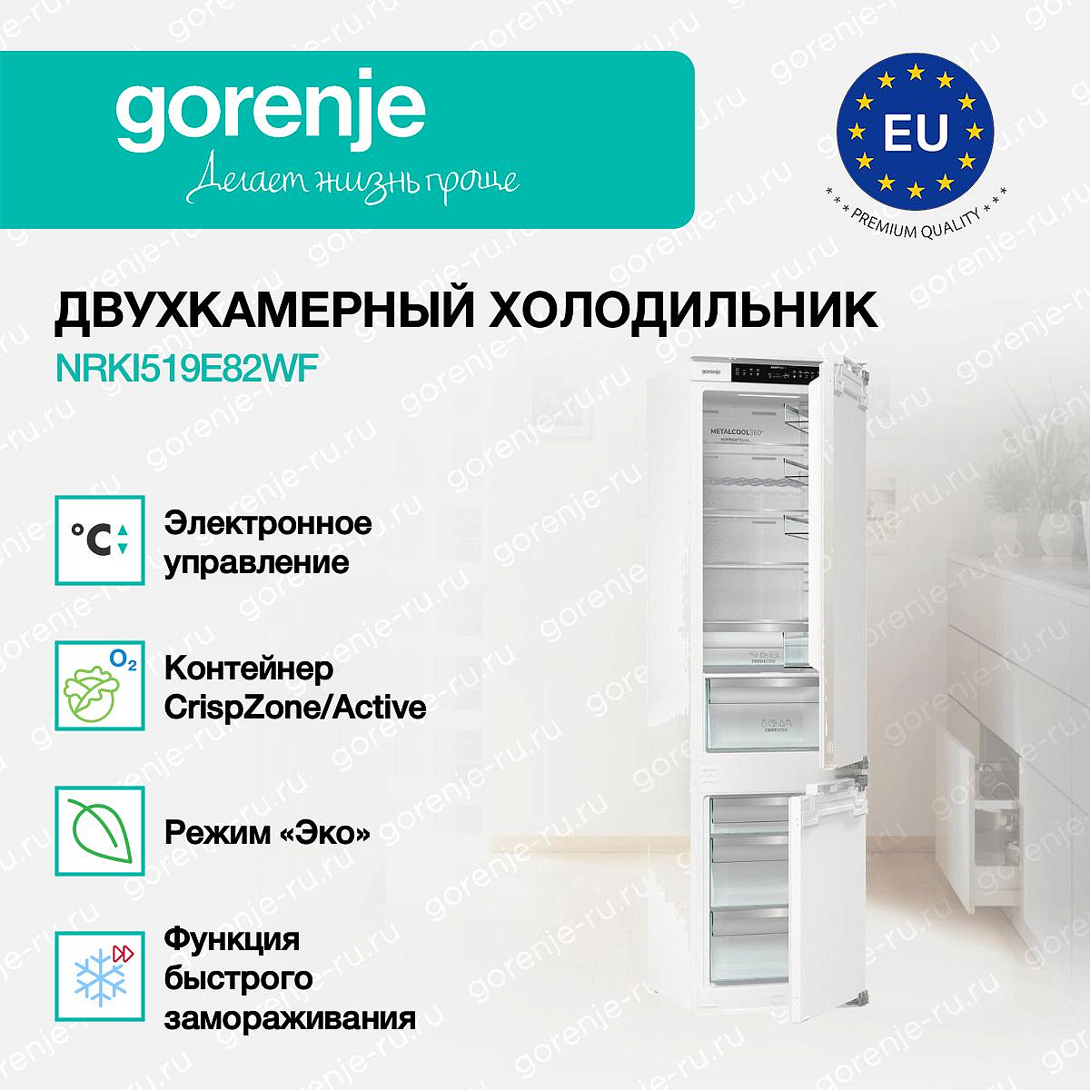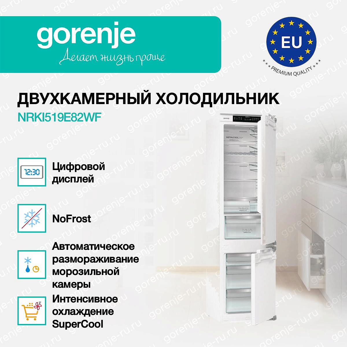 ** Все информационные материалы, представленные на Сайте, носят справочный характер и не могут в полной мере передавать достоверную информацию о свойствах, комплектации и характеристиках товара, включая цвета, размеры и формы. Фирма-производитель оставляет за собой право на внесение изменений в конструкцию, дизайн и комплектацию товара без предварительного уведомления. Перед оформлением Заказа Покупатель должен обратиться к Продавцу для уточнения свойств и характеристик Товара. Подробная информация о товаре указывается в инструкции и на упаковке товара. Используемое название в России: Горенье NRKI519E82WF