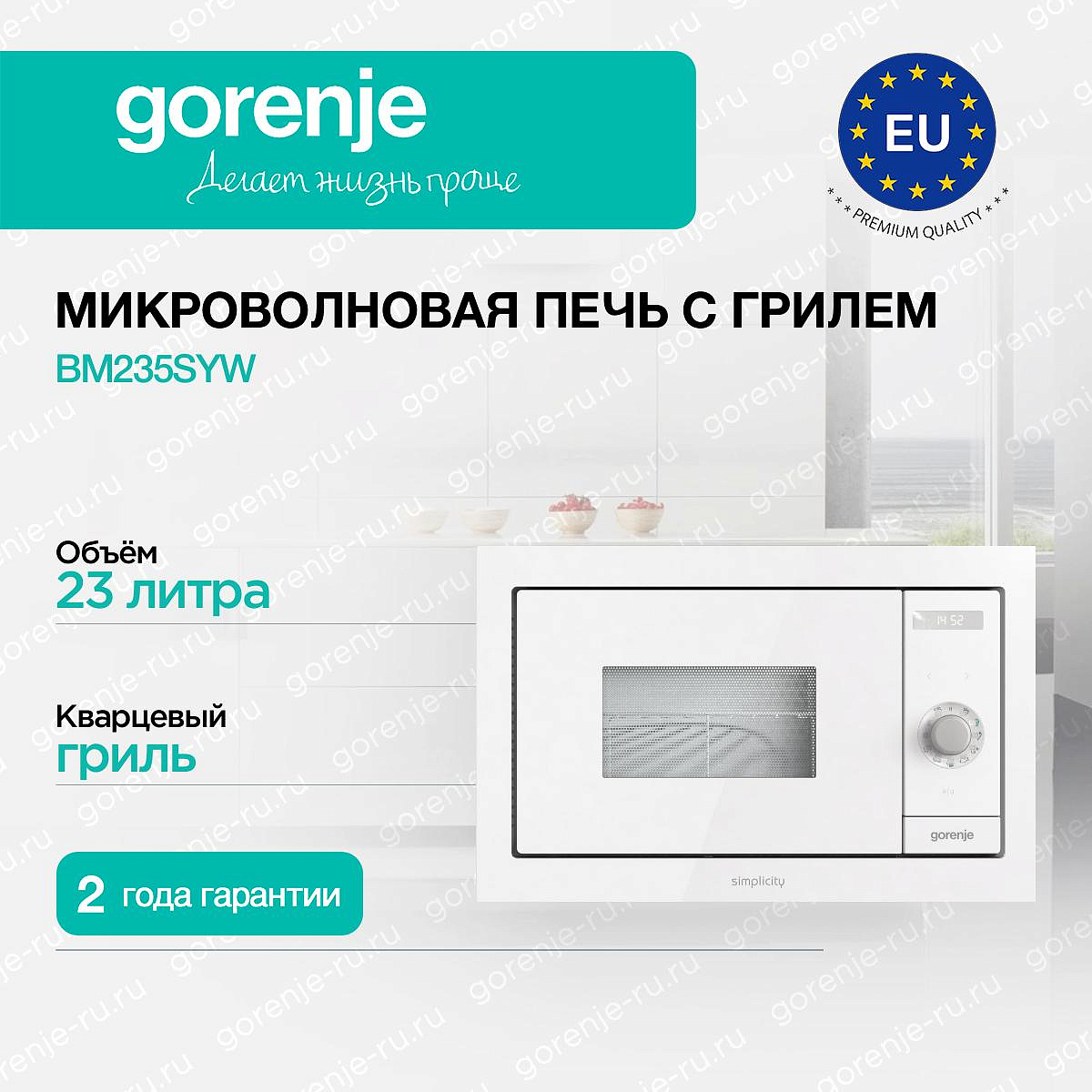 ** Все информационные материалы, представленные на Сайте, носят справочный характер и не могут в полной мере передавать достоверную информацию о свойствах, комплектации и характеристиках товара, включая цвета, размеры и формы. Фирма-производитель оставляет за собой право на внесение изменений в конструкцию, дизайн и комплектацию товара без предварительного уведомления. Перед оформлением Заказа Покупатель должен обратиться к Продавцу для уточнения свойств и характеристик Товара. Подробная информация о товаре указывается в инструкции и на упаковке товара. Используемое название в России: Горенье BM235SYW