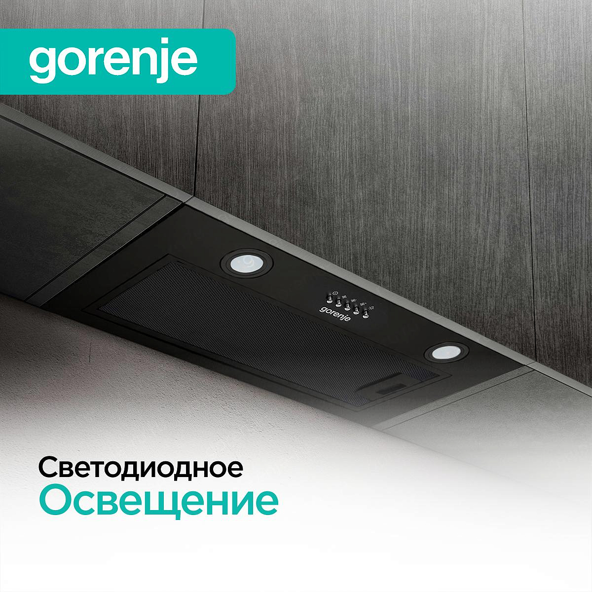 Чёрная встраиваемая вытяжка от Gorenje идеально подходит для современных кухонь, гармонично сочетая стиль и функциональность. Корпус выполнен из крашеного металла, что придаёт устройству элегантный внешний вид и обеспечивает долговечность. Декоративный короб изготовлен из нержавеющей стали — материала, устойчивого к коррозии и механическим повреждениям, что гарантирует продолжительный срок службы.