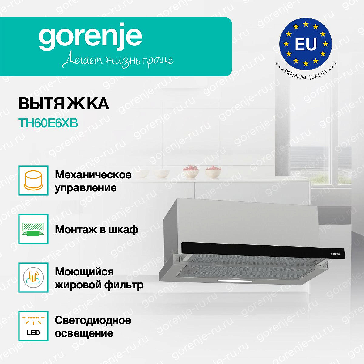 ** Все информационные материалы, представленные на Сайте, носят справочный характер и не могут в полной мере передавать достоверную информацию о свойствах, комплектации и характеристиках товара, включая цвета, размеры и формы. Фирма-производитель оставляет за собой право на внесение изменений в конструкцию, дизайн и комплектацию товара без предварительного уведомления. Перед оформлением Заказа Покупатель должен обратиться к Продавцу для уточнения свойств и характеристик Товара. Подробная информация о товаре указывается в инструкции и на упаковке товара. Используемое название в России: Горенье TH60E6XB